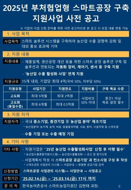이미지 확대보기한국농어촌공사와 중소벤처기업부, 스마트제조혁신추진단은 국내 농산업 제조기업의 해외 시장 진출 활성화를 위해 '2025년 부처 협업형 농산업 스마트공장 구축 지원사업'에 참여할 기업을 다음달 14일까지 모집한다.