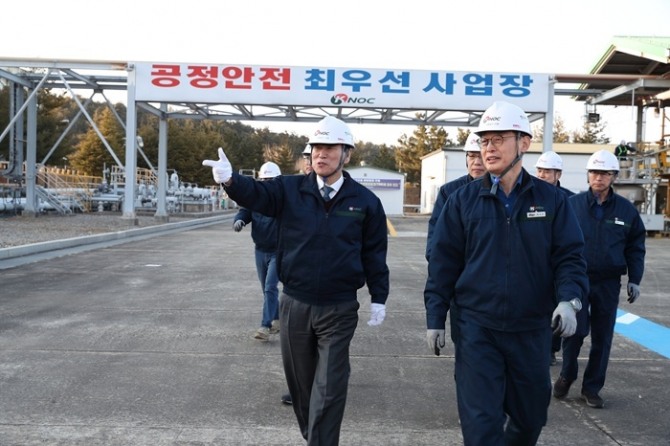 이미지 확대보기한국석유공사 김동섭 사장이 지난 26일 해빙기 안전사고 예방을 위해 동해 비축기지를 찾아 현장 안전경영을 실시했다.