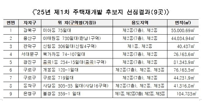이미지 확대보기1일 정비업계에 따르면 서울시가 지난달 27일 올해 제1차 주택재개발사업 후보지 선정위원회를 개최하고 후보지 9곳을 선정했다.