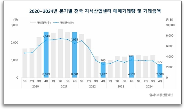 이미지 확대보기11일 부동산업계에 따르면 부동산플래닛이 이날 발표한 2024년 4분기 전국 지식산업센터 매매시장 동향 보고서를 살펴본 결과 지난해 4분기 전국 지식산업센터 거래량은 672건, 거래금액은 2569억원으로 전분기 대비 거래량 29.9%, 거래액 39.8%가 각각 하락했다.