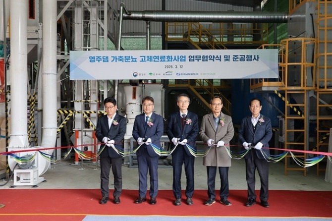 이미지 확대보기한국수자원공사(K-water)가 환경부를 비롯한 영주시, 한국남부발전, 영주축산농협과 함께 지난 12일 경북 영주시 부석면 생축사업소에서 ‘영주댐 가축분뇨 고체연료화 사업 공동 추진 업무협약’을 체결했다고 13일 밝혔다.