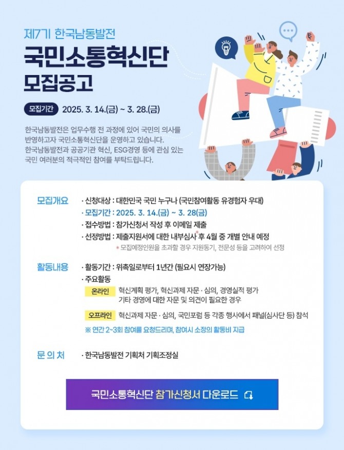 이미지 확대보기한국남동발전은 대국민 소통 강화와 ESG경영 실천을 위한 ‘제7기 국민소통혁신단’을 모집한다.