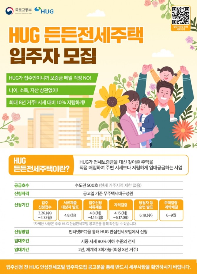 이미지 확대보기주택도시보증공사(HUG)는 오는 26일부터 총 500호 규모의 제6차 든든전세주택 입주자 모집공고를 실시한다고 20일 밝혔다.