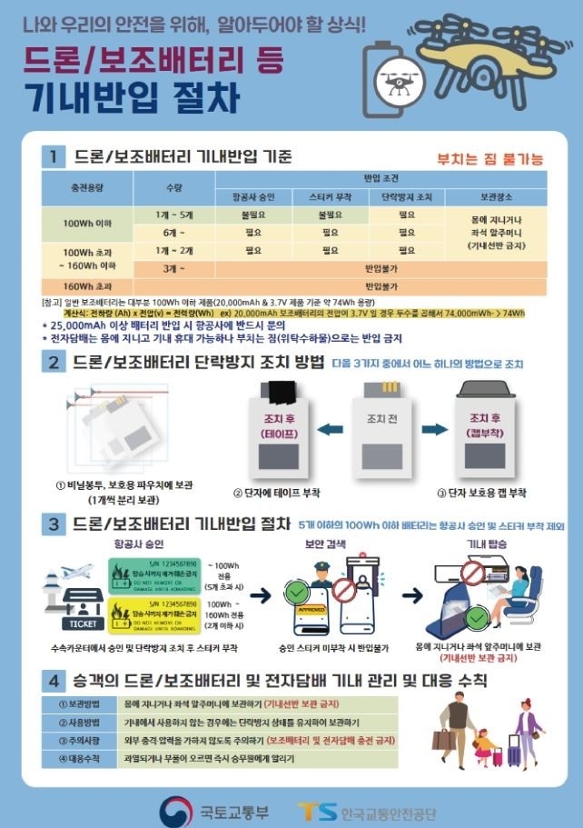 이미지 확대보기한국교통안전공단(TS)은 드론 배터리‧보조배터리 기내 반입 절차와 제주국제공항 주변 불법 드론 비행 방지 가이드라인을 안내한다고 20일 밝혔다.