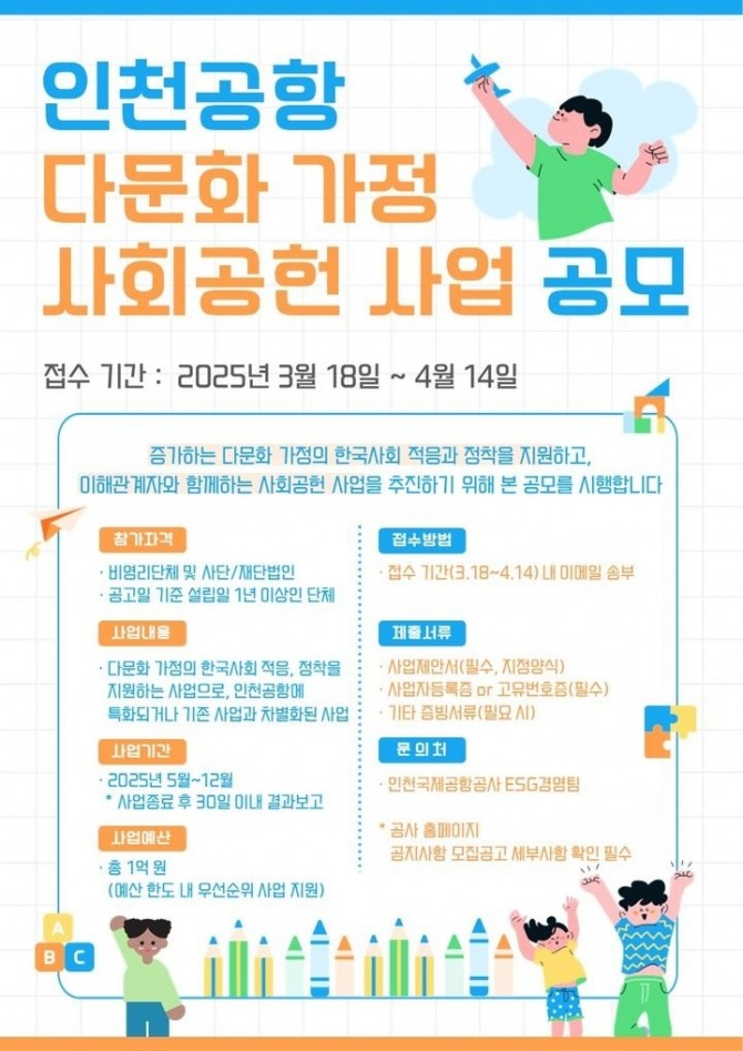 이미지 확대보기인천국제공항공사가 오는 4월 14일까지 다문화 가정의 한국사회 정착을 위한 사회공헌 사업에 참여할 기업을 공모한다고 21일 밝혔다.