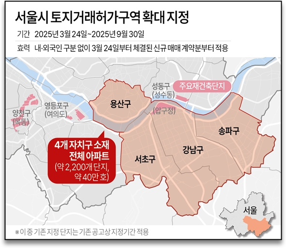 강남 3구와 용산구는 이번 토지거래허가구역 지정으로 기존 투기과열지구, 조정대상지역까지 '3중 규제'를 받게 됐다.