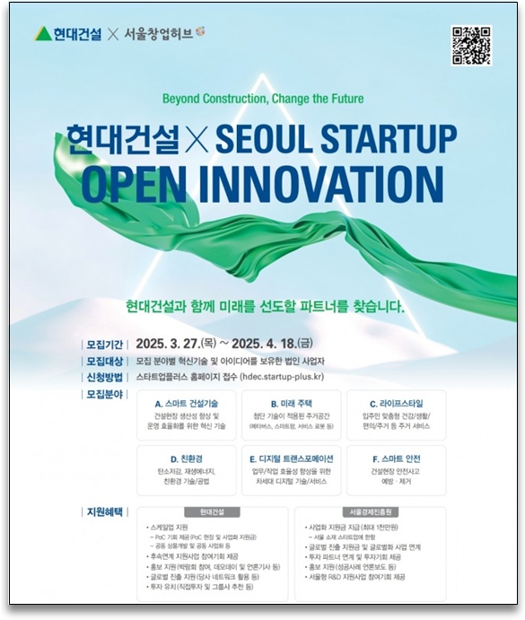 현대건설은 선발된 스타트업의 안정적인 성장과 지속 가능한 협력 기반 구축을 위해 다양한 후속 연계 지원을 제공할 계획이다.
