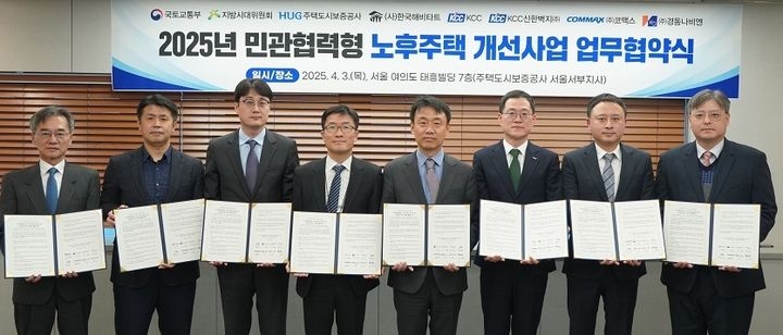 7일 주택도시보증공(HUG)에 따르면 지난 3일 7개 기관은 HUG를 비롯해 국토교통부, 지방시대위원회, KCC, 코맥스, KCC 신한벽지, 경동나비엔, 한국해비타트 등이 민관협력형 노후주택 개선사업 업무협약을 체결하고 3억원을 기부하기로 했다.