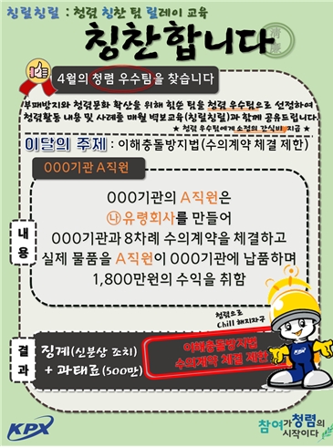 이미지 확대보기전력거래소는 청렴 문화 확산을 위해 '칭찬 릴레이(칭릴칭릴)' 프로그램을 4월부터 도입한다. 이 프로그램을 통해 매월 투명한 업무 수행과 청렴한 조직문화 조성에 기여한 팀을 '이달의 청렴 팀'으로 선정해 포상하고, 해당 팀의 우수 청렴사례를 전 직원 교육자료로 활용할 예정이다.