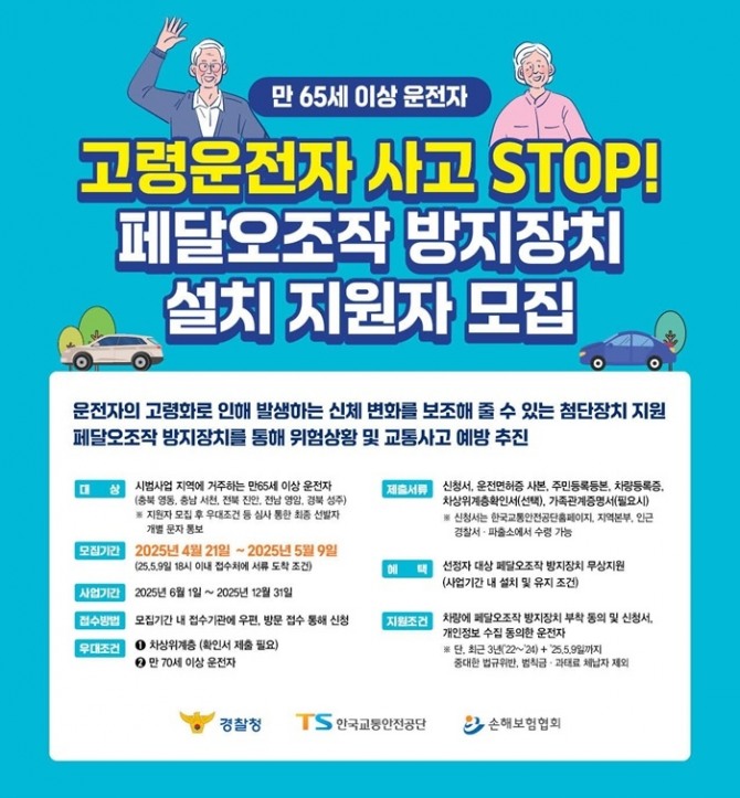 TS, 경찰청, 손해보험협회는 앞서 고령운전자의 교통안전 확보에 상호 협력하기로 지난해 11월 협약했으며, 페달 오조작 방지장치 무상 보급을 추진하기로 했다.