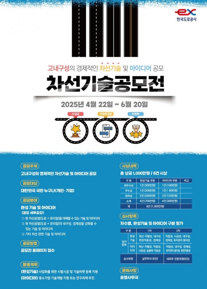 이미지 확대보기한국도로공사가 오는 6월 20일까지 혁신적인 고속도로 차선기술 발굴을 위한 ‘대국민 차선(車線)기술 공모전’을 개최한다.