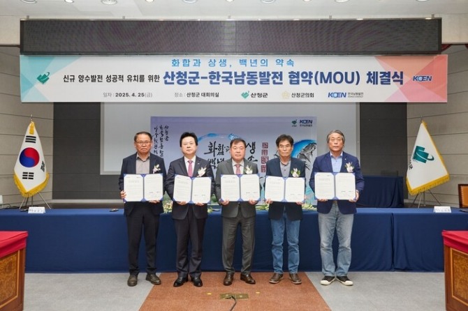 이미지 확대보기한국남동발전은 지난 25일 산청군청에서 강기윤 한국남동발전 사장, 이승화 산청군수, 김수한 산청군의회 의장을 비롯한 산청군 주민 대표들이 참석한 가운데, 신규 양수발전 유치를 위한 ‘상호협력 협약 및 상생협력 협약’을 체결했다.