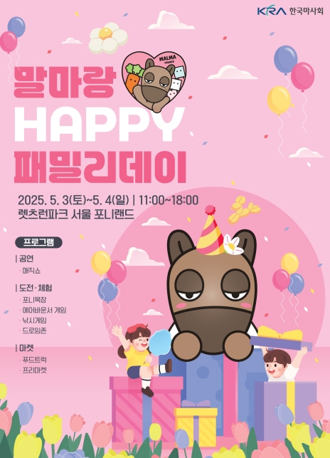 2일 마사회에 따르면, 양일간 오전 11시부터 오후 6시까지 진행되는 이번 행사 주요 프로그램에는 △마술쇼(4회) △숨은 말마 찾기 △에어바운서 플레이(축구·농구·양궁) △텐트 드로잉 △분필로 아트 △친환경 화분 만들기 △낚시 놀이 등이 있다. 또 △버블 놀이 △대형 젠가·도미노·콘홀 게임 등 자율 체험 프로그램이 상시 운영된다.