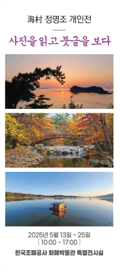 이미지 확대보기한국조폐공사 화폐박물관은 오는 25일까지 특별전시실에서 정명조 작가의 개인전 ‘사진을 읽고 붓글을 보다’를 개최한다.