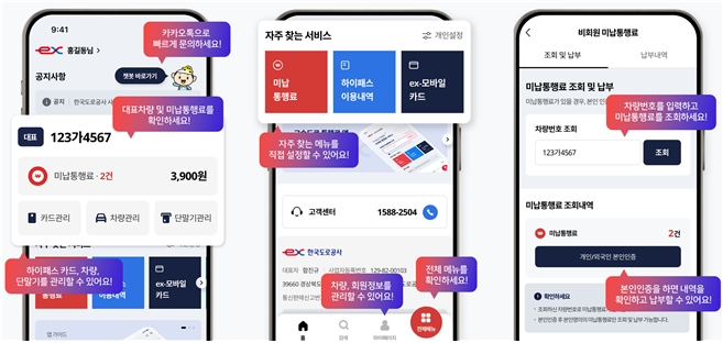 새로 출시된 앱은 회원가입 없이 본인인증만으로 간편하게 미납통행료 조회 및 납부와 환불통행료 신청․조회가 가능해졌으며, 하이패스 이용내역 조회, ex-선불․모바일충전카드 등록 및 조회 등의 기능을 제공한다.