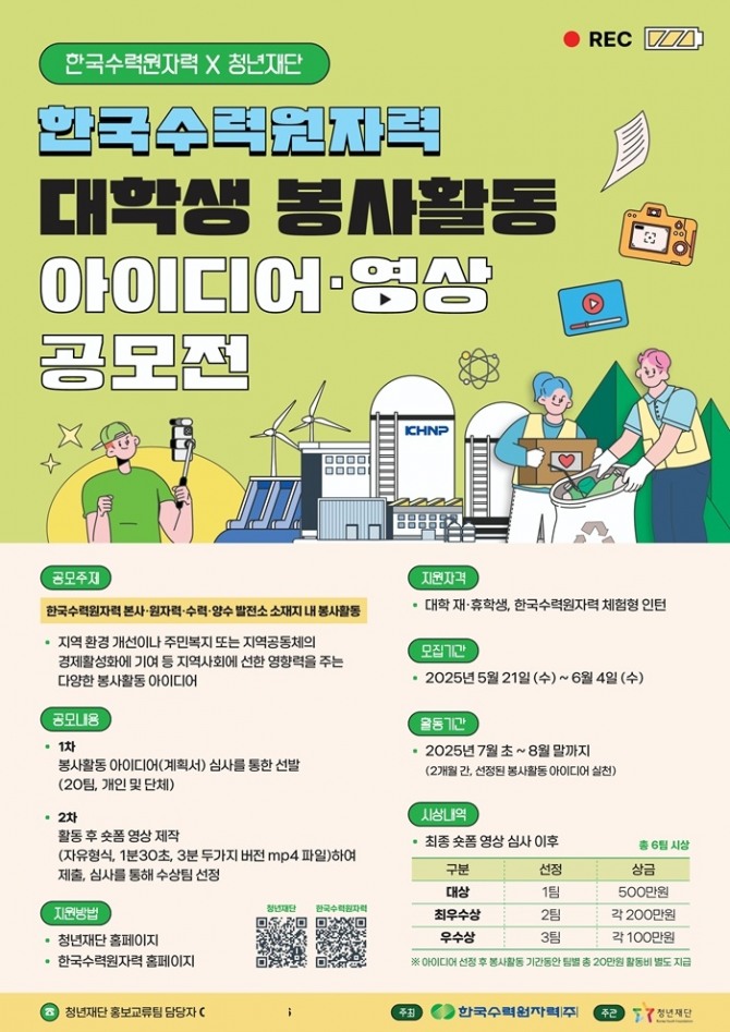 자세한 공모전 내용과 신청 방법은 한수원과 협업기관인 청년재단 누리집에서 확인할 수 있다.