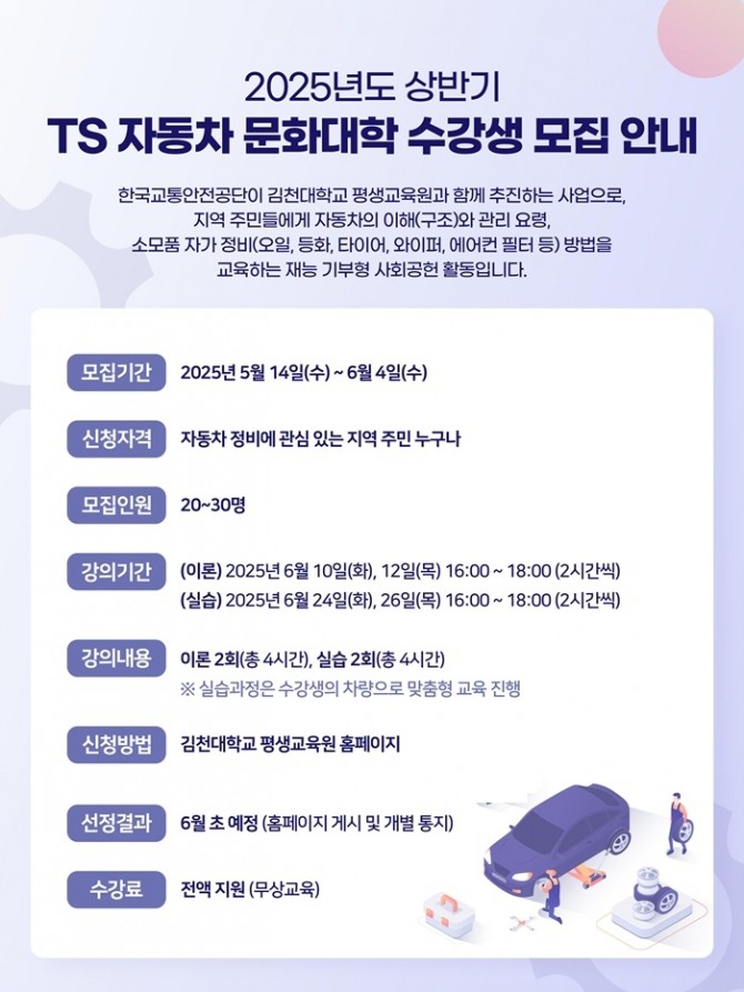 이미지 확대보기한국교통안전공단(TS)은 6월 10일부터 3주간 김천대학교 평생교육원에서 2025년 상반기 TS 자동차 문화대학을 운영한다고 23일 밝혔다.