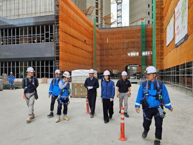 10일 건설업계에 따르면 DL이앤씨 이길포 CSO(최고안전책임자)가 지난달 29일 고용노동부 진주지청장, 산재예방과장, 근로감독관과 함께 경남 지역 현장을 찾아 폭염 대비 상태 점검을 진행했다.