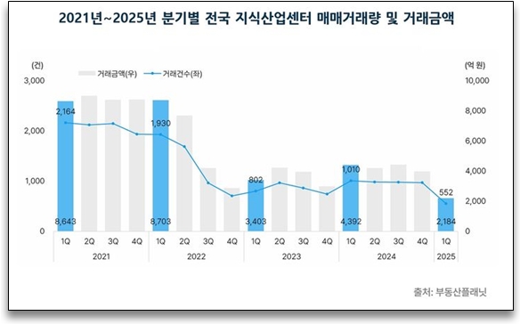 이미지 확대보기10일 건설업계에 따르면 상업용 부동산 기업 부동산플래닛이 이날 공개한 전국 지식산업센터 매매시장 동향을 살펴 본 결과 1분기(1∼3월) 거래량이 총 552건으로 직전 분기(971건) 대비 43.2% 하락한 것으로 집계됐다.