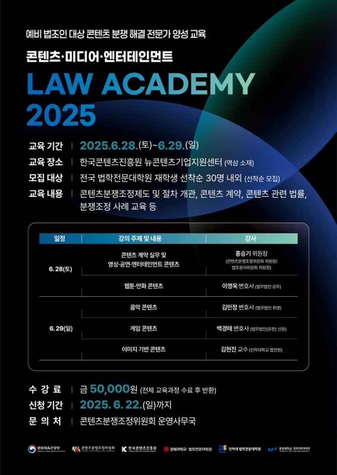 콘분위와 3개 법전원은 이번 협약을 통해 △콘텐츠 계약 및 저작권 등 실무 중심의 강의 △영상, 음악, 웹툰, 게임 등 분야별 분쟁 사례 교육 △콘텐츠분쟁조정위원회 활동 소개 및 수료증 발급 등 아카데미 프로그램 전반을 공동으로 기획·운영한다.
