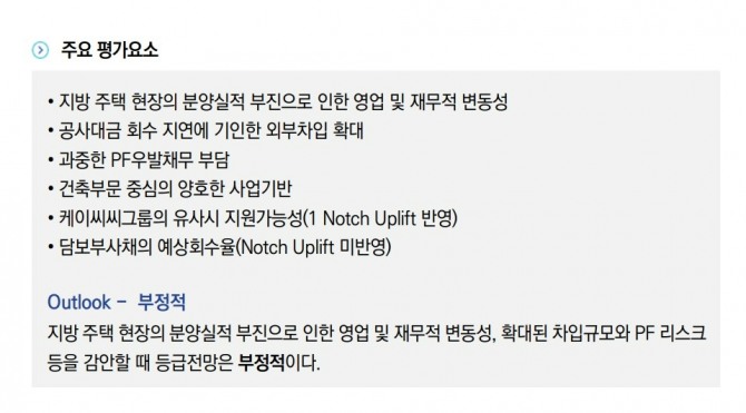 한신평은 “지방 주택 현장의 분양실적 부진으로 인한 영업 및 재무적 변동성이 지속되고 있다”고 설명했다.