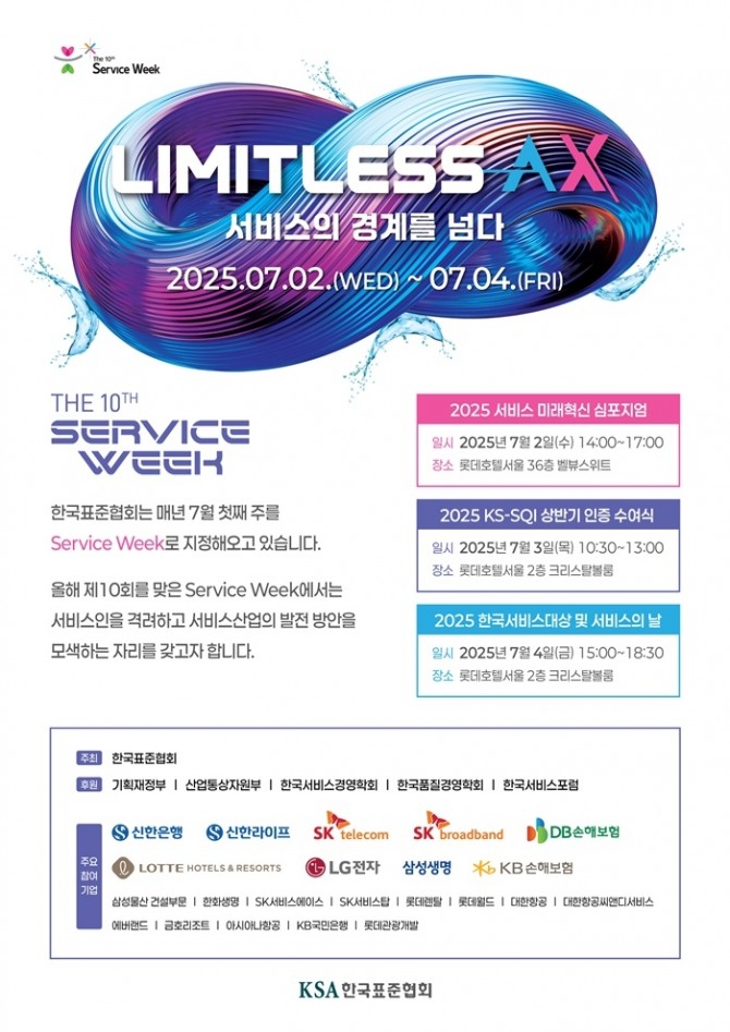 첫날인 7월 2일에는 ‘서비스 미래혁신 심포지엄’을, 둘째 날인 7월 3일에는 ‘2025년 상반기 한국서비스품질지수(KS-SQI) 인증수여식’을, 마지막 날인 7월 4일에는 ‘한국서비스대상 시상식 및 서비스의 날’을 통해 국내 서비스 산업의 우수사례와 발전 방향을 조망한다.