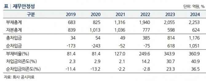 또 “2022~2023년 적자로 자기자본 규모가 2021년 1036억원에서 지난해 624억원으로 감소했다”며 “매출채권 회수 지연 등 높은 운전자금 부담으로 회사의 부채비율과 순차입금의존도가 2022년 말 249.6%, -2.8%에서 2024년 말 360.9%, 36.5%로 상승했다”고 짚었다.