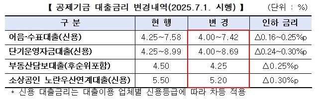 이번 조치로 중소기업공제기금의 대출금리는 최대 0.30%p 인하된다. △단기운영자금대출은 연 4.00~8.69% △어음·수표대출은 연 4.00~7.42% △부동산담보대출은 4.25%로 낮아지며, 내수부진 등으로 특히 어려운 소상공인을 위해 △소상공인 노란우산연계대출은 0.30%p 인하해 5.20%의 금리로 시행된다.