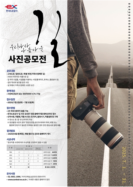 한국도로공사 관계자는 “길 뿐만 아니라 길 위의 시설물이나 사람들도 사진전의 주요 주제가 되는 만큼, 다양한 시각과 개성을 담은 독창적인 작품들이 많이 출품되기를 기대한다”라고 말했다.