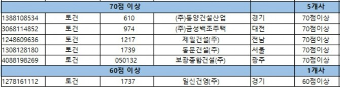또 동양건설산업과 효성중공업 건설부문, 금성백조, 제일건설, 동문건설은 일신건영 보다는 점수가 높지만 70점대로 보통 등급을 받았다.