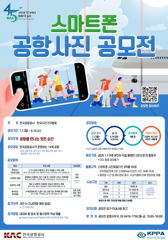 공모분야는 공사가 운영하는 14개 공항을 배경으로 한 △편리하고 안전한 공항 △스마트한 공항 △나만의 감성 공항 △특색있는 지역공항으로, 2025년 1월 1일 이후 본인이 직접 스마트폰으로 촬영한 사진이어야 하며, 연령 등 제한없이 누구나 응모할 수 있다. 출품은 1인 3작품 이내로 가능하다.