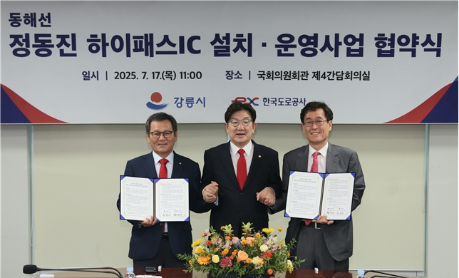 이미지 확대보기한국도로공사는 지난 17일 국회 의원회관에서 강릉시와 ‘동해고속도로 정동진 하이패스IC(속초방향) 설치’를 위한 업무협약을 체결했다고 18일 밝혔다.