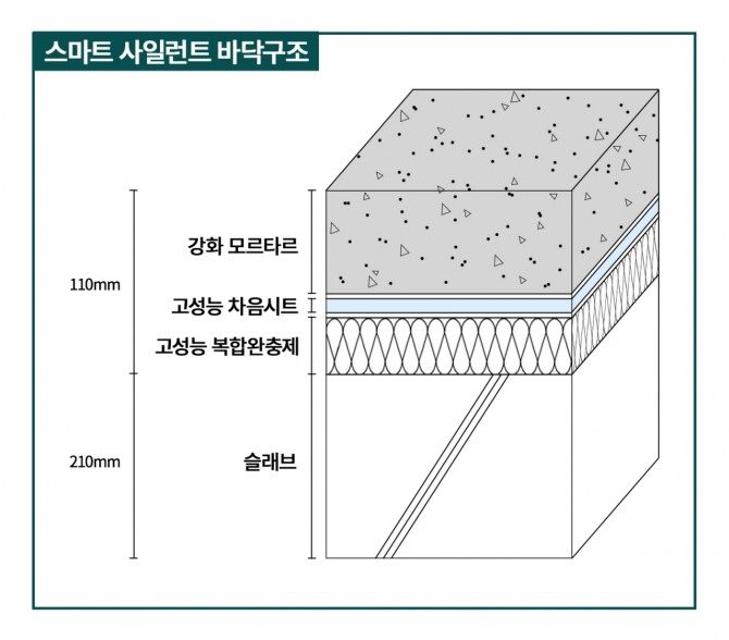 스마트 사일런트 바닥구조는 경량충격음과 중량충격음 모두 1등급 성능을 획득한 기술이다. 흡음재·탄성체·차음시트로 구성된 다층 복합구조를 통해 210mm 슬래브에서도 층고 증가 없이 최상위 등급의 성능을 구현한 것이 특징이다.