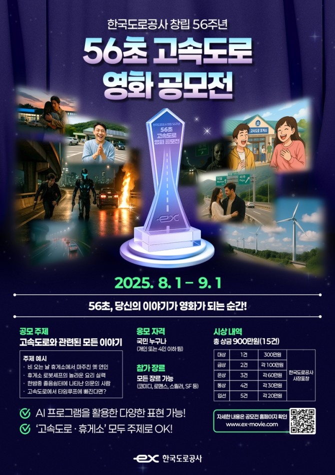 이미지 확대보기한국도로공사가 올해 창립 56주년을 기념해 오는 9월 1일까지 고속도로와 휴게소를 주제로 한 ‘56초 고속도로 영화 공모전’을 개최한다.
