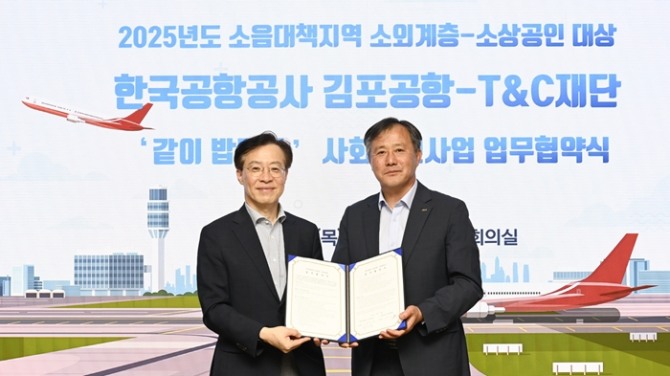 이미지 확대보기한국공항공사 김포공항은 지난달 31일 티앤씨재단과 소음대책지역 사회공헌사업 '같이 밥먹차*' 업무협약을 체결했다.