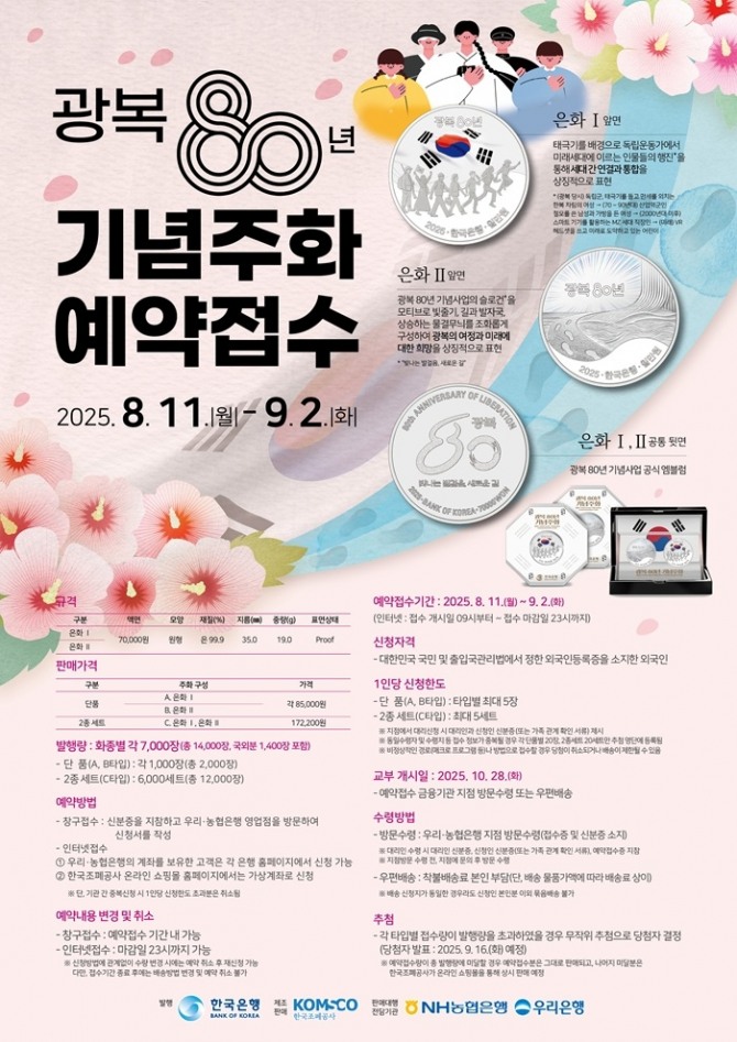 광복 80년 기념주화 판매는 선착순이 아닌 추첨식 예약제로 진행되며, 접수 수량이 발행 수량을 초과할 경우 무작위 추첨을 통해 당첨자가 선정된다.