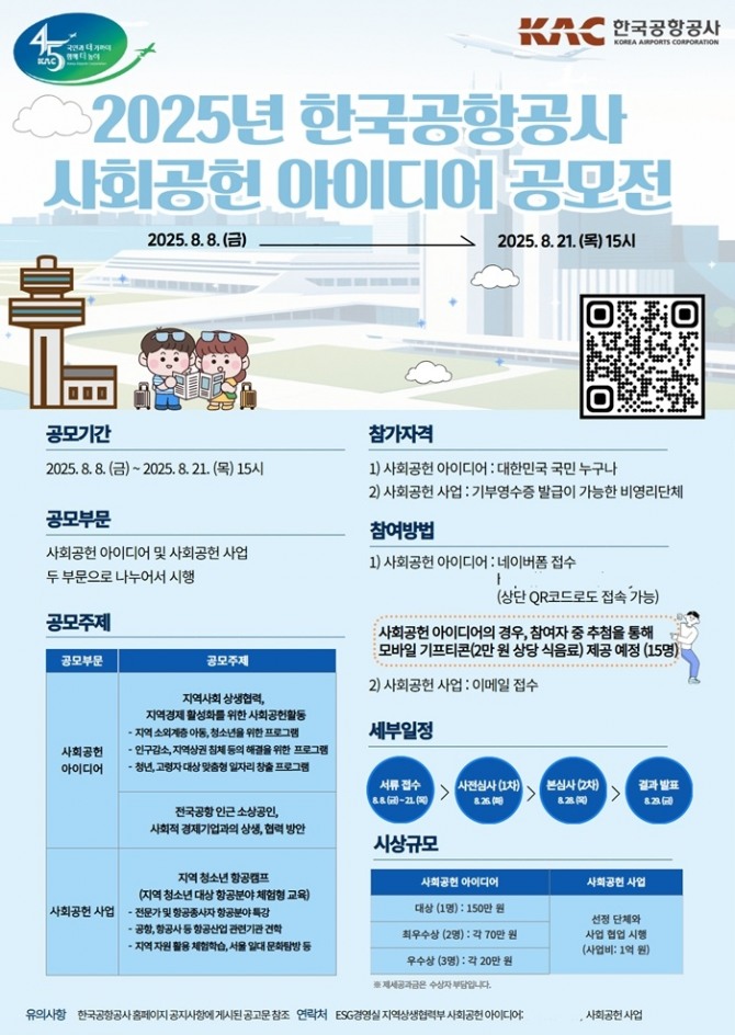 이미지 확대보기한국공항공사가 오는 21일까지 국민이 참여하는 '2025년 사회공헌 아이디어 공모전'을 개최한다.