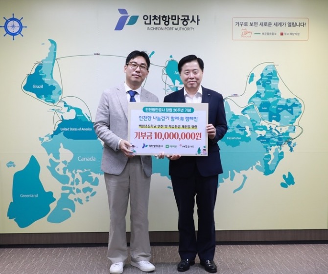이미지 확대보기인천항만공사는 창립 20주년을 맞아 지난 6월부터 한 달간 시민과 함께하는 걸음 기부 캠페인 ‘인천항 나눔걷기 함께海’를 마치고 ‘사단법인 따뜻한하루’에 백령초등학교 학습환경 개선을 위한 기부금 1000만원을 기부했다.