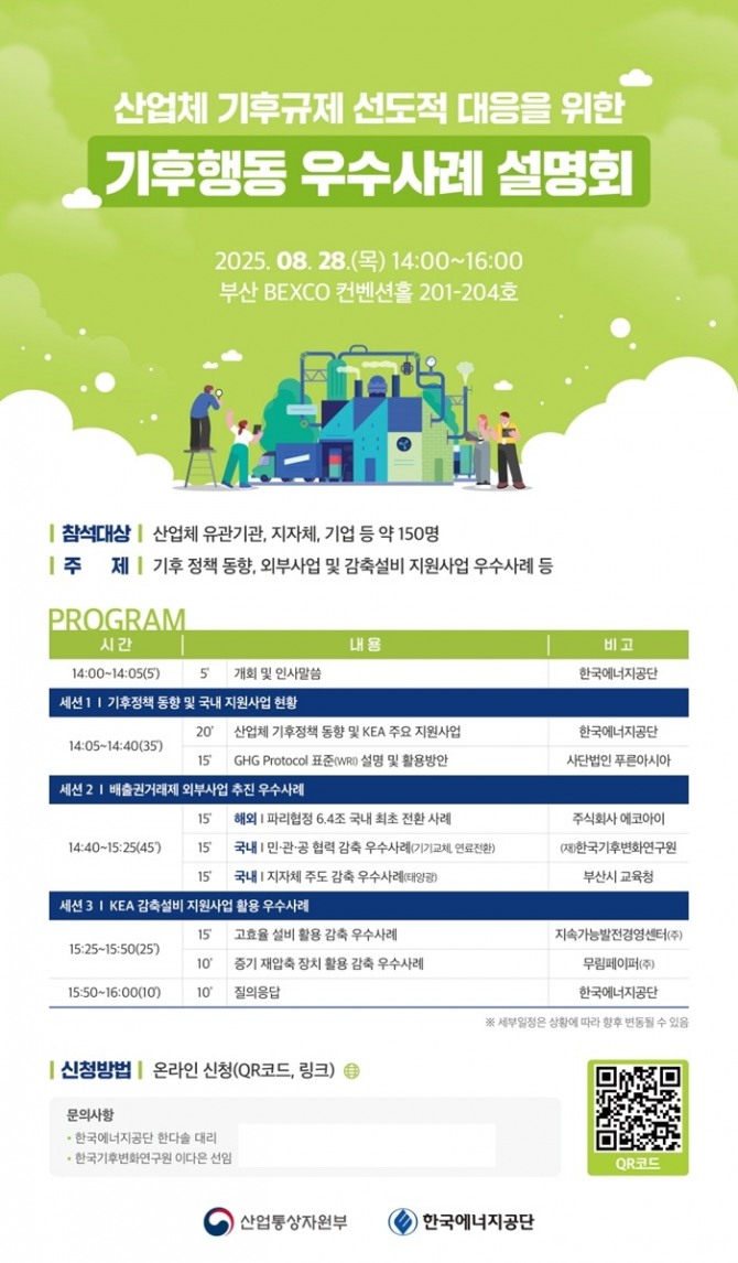 이미지 확대보기한국에너지공단은 오는 28일 부산 BEXCO 컨벤션홀에서 '산업체 기후규제 선도적 대응을 위한 기후행동 우수사례 설명회'(이하 설명회)를 개최한다고 26일 밝혔다.