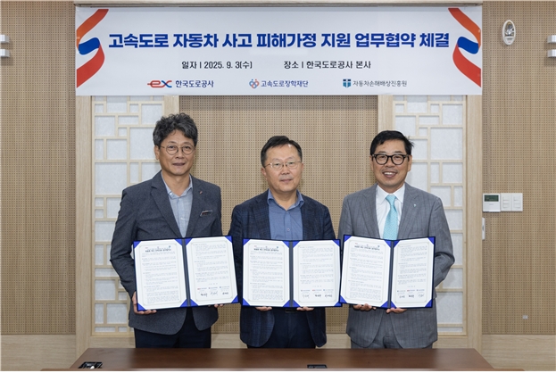 이미지 확대보기한국도로공사는 지난 3일 고속도로장학재단, 자동차손해배상진흥원과 ‘고속도로 자동차 사고 피해가정 자녀 대상 맞춤형 복지 지원 업무협약’을 체결했다고 4일 밝혔다.