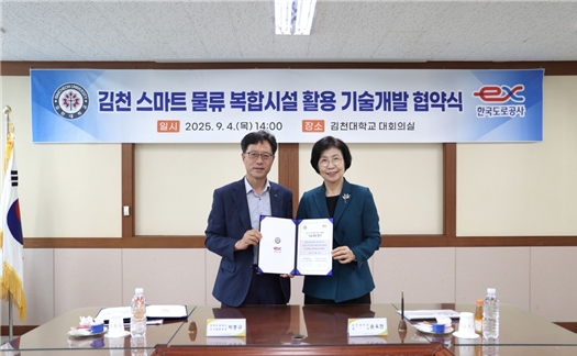 이미지 확대보기한국도로공사는 지난 4일 김천대학교 산학협력단의 드론아이즈와 ‘김천 스마트 물류 복합시설 활용 기술개발’을 위한 업무협약을 체결했다고 5일 밝혔다.