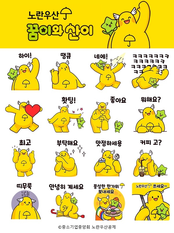 노란우산 가입자 소기업·소상공인을 상징하며 별처럼 빛나는 내일을 꿈꾸는 ‘꿈이’와 그 곁에서 든든한 우산 역할을 하는 노란우산공제 상징 ‘산이’ 캐릭터를 활용하여 감사, 사랑, 응원, 명절인사 등 일상의 다양한 감정을 표현하는 16종의 움직이는 이모티콘을 선보인다.