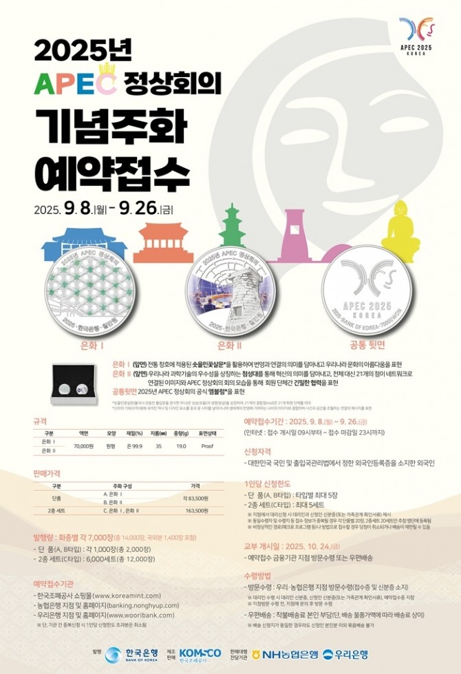 이미지 확대보기한국조폐공사는 8일부터 26일까지 ‘2025년 APEC 정상회의 기념주화’ 예약 접수를 진행한다.