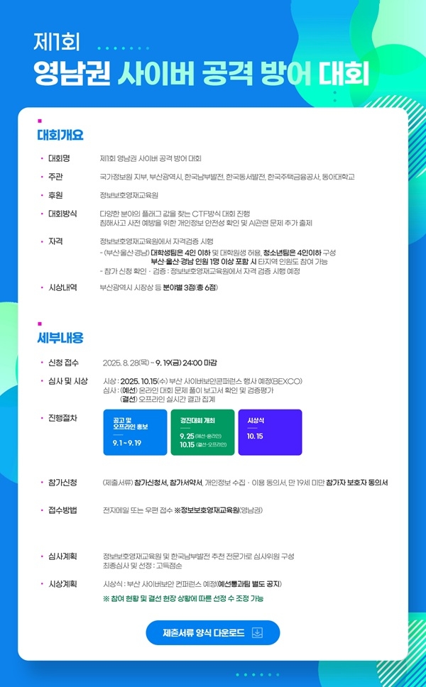 남부발전 정보보안실 관계자는 “이번 대회는 단순한 경쟁을 넘어, 지역의 사이버보안 생태계를 조성하고 미래 인재를 발굴하는 의미있는 장이 될 것”이라며, “AI 시대를 이끌어갈 젊은 보안 인재들의 많은 관심과 참여를 바란다”고 밝혔다.