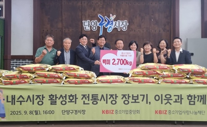 이미지 확대보기중소기업사랑나눔재단은 지역경제 활성화와 나눔문화 확산을 위해 충북 단양구경시장을 방문해 1000만원 상당의 쌀 2700㎏ 구입하고 지역복지시설에 전달했다.