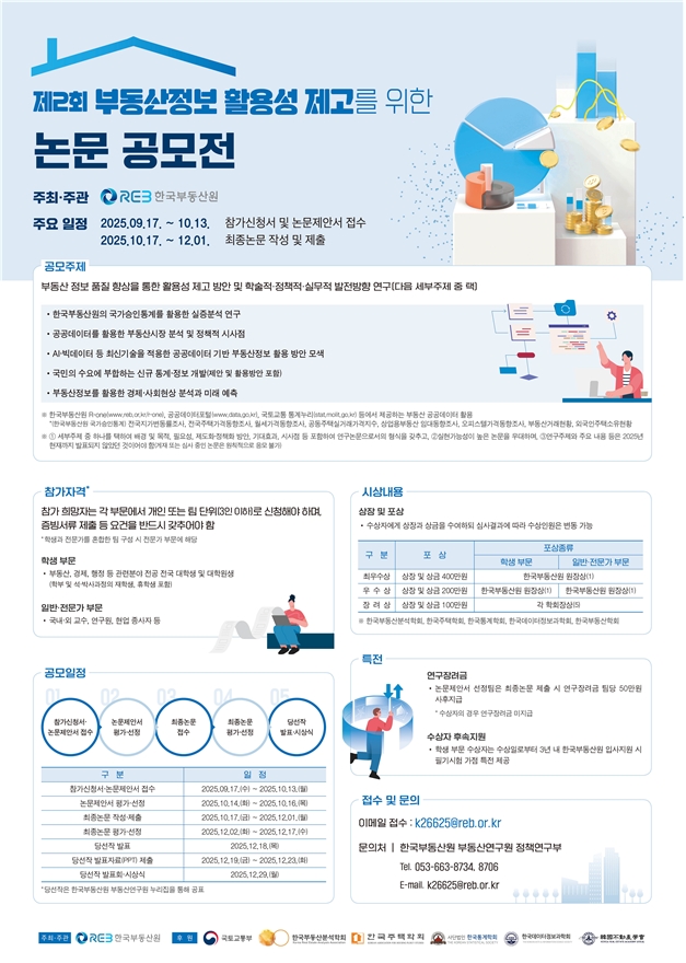 이미지 확대보기한국부동산원은 10월 13일까지 '제2회 부동산정보 활용성 제고를 위한 논문 공모전'을 접수한다고 17일 밝혔다.