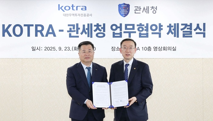 이미지 확대보기코트라는 관세청과 지난 23일 서울 서초구 코트라 본사에서 수출기업 지원을 위한 업무협약(MOU)을 체결했다고 24일 밝혔다. 지난 8월 한국원산지정보원과 업무협약(MOU) 체결에 이어 관세 분야까지 지원망을 촘촘히 강화해 우리 기업의 대미 수출 안정성을 높인다는 목표다.
