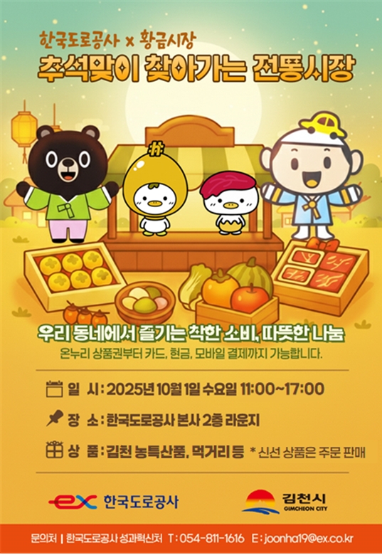 이번 협약을 계기로 한국도로공사는 내달 1일 본사 2층 라운지에서 조선시대 5대 시장으로 꼽힌 김천장의 명맥을 잇고 있는 김천시 황금시장 상인회와 함께 ‘추석맞이 찾아가는 전통시장’ 행사를 열기로 했다.