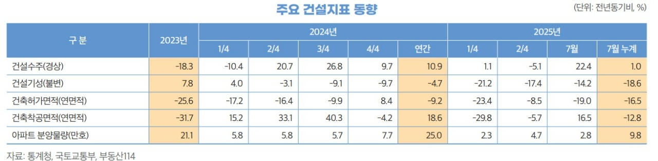 건정연은 “3분기 건설경기는 선행지표와 동행지표 모두 부진한 것으로 평가할 수 있다”며 “하반기 이후 수주와 착공 물량 회복세가 확인되지 않으면 내년에도 부진할 가능성이 크다”고전망했다.