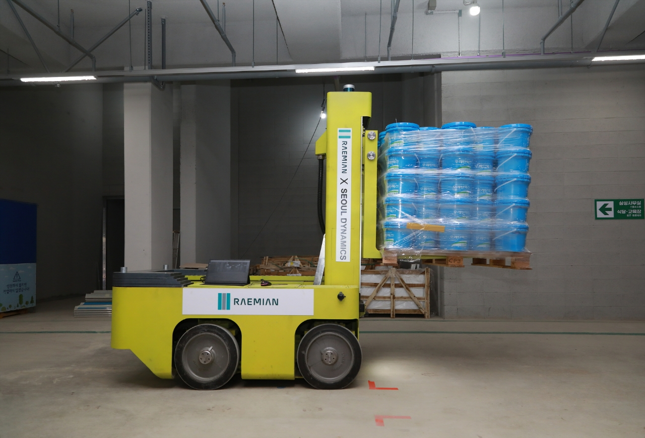 자율주행 지게차는 현장에 야적된 팔레트를 인식해 자재를 지하의 아파트 각 동 별 지정된 장소로 운반한다. 이후 자재 이동 로봇은 분배된 자재를 싣고 엘리베이터를 호출하고 탑승해 아파트 호실 내부까지 운반·하역한다.